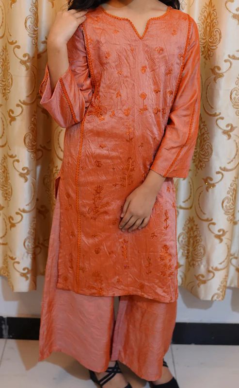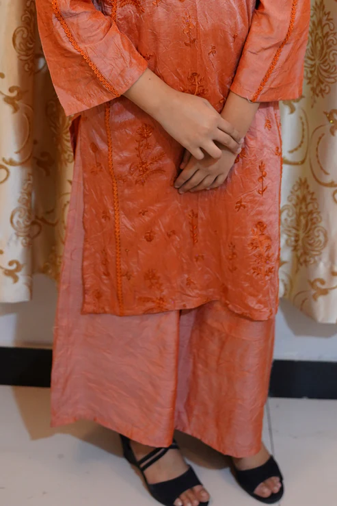 This rust orange cotton silk kurti with flapper features delicate sequin embroidery, offering a perfect blend of elegance and shimmer. Its soft, luxurious fabric makes it ideal for festive occasions and semi-formal gatherings.